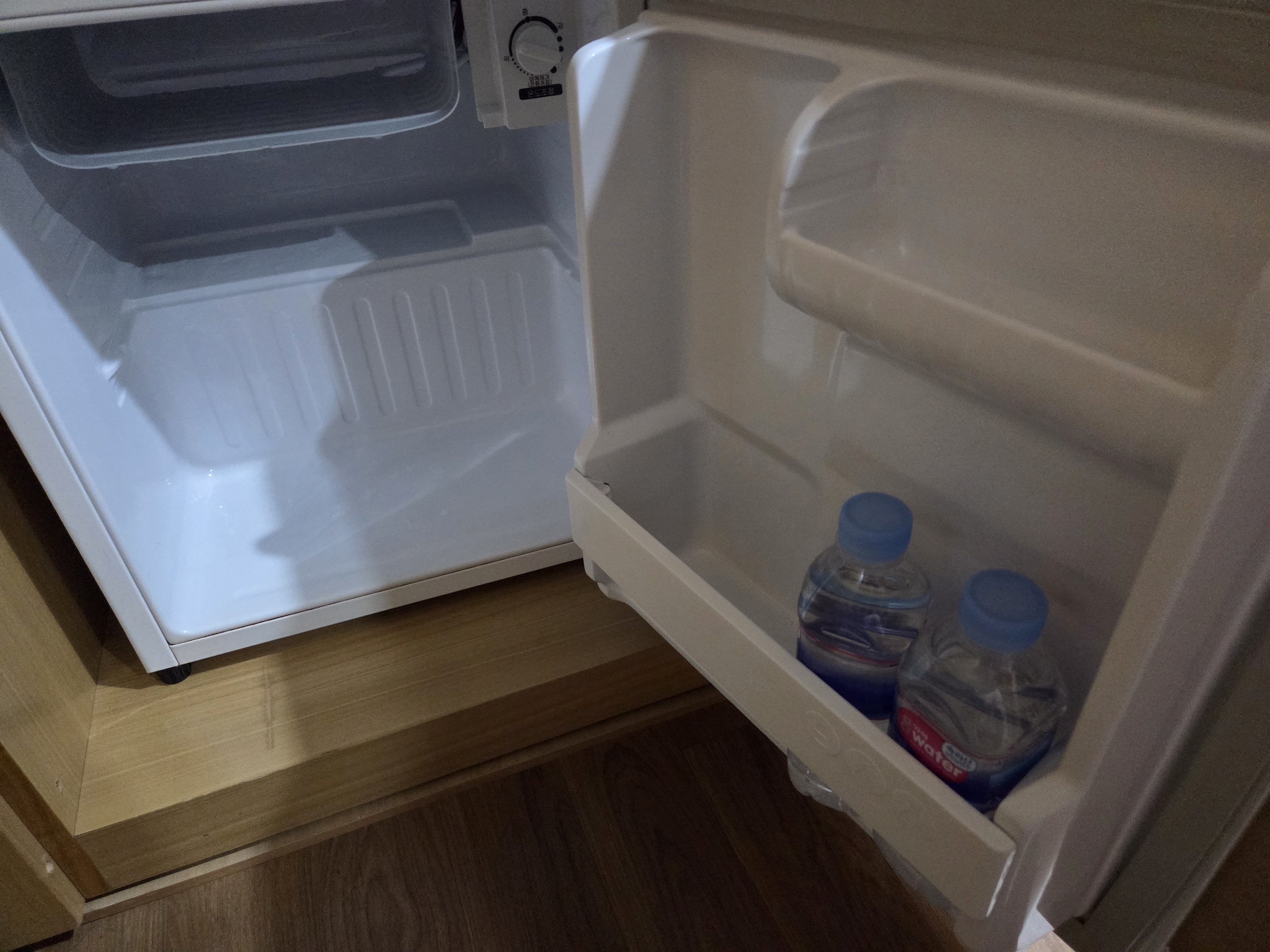 옷장 옆에는 오래되보이기는 하지만 티포트와 티백, 커피가 있구요, 미니 냉장고가 있습니다. 냉장고에는 생수 2병이 들어있었습니다.
