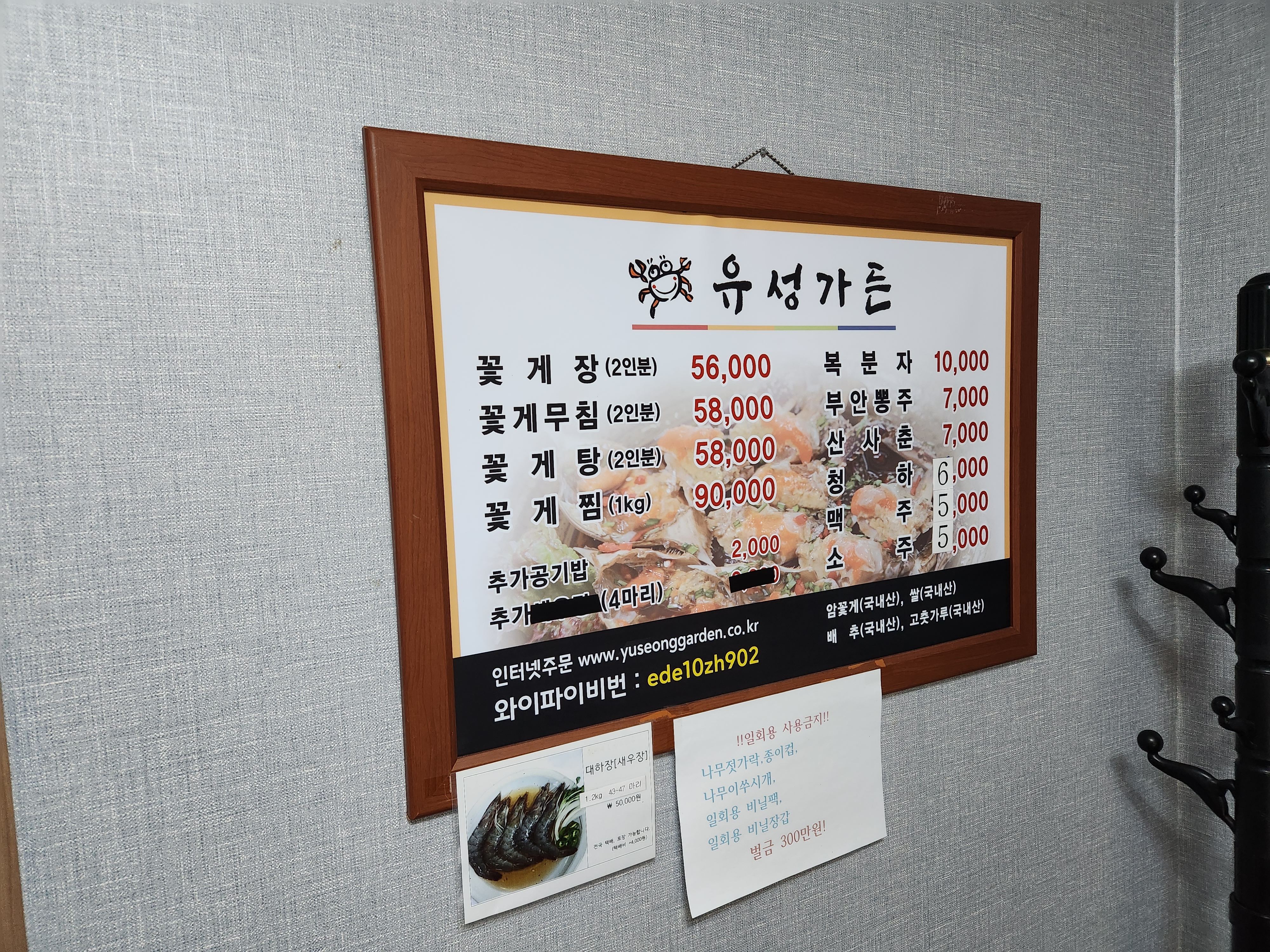 유성가든 메뉴입니다. 지금('25.6월 기준)은 꽃게장, 꽃게무침, 꽃게탕 모두 인당 3만원으로 가격이 올랐습니다. 모든 메뉴는 2인분 부터 주문 할 수 있습니다.