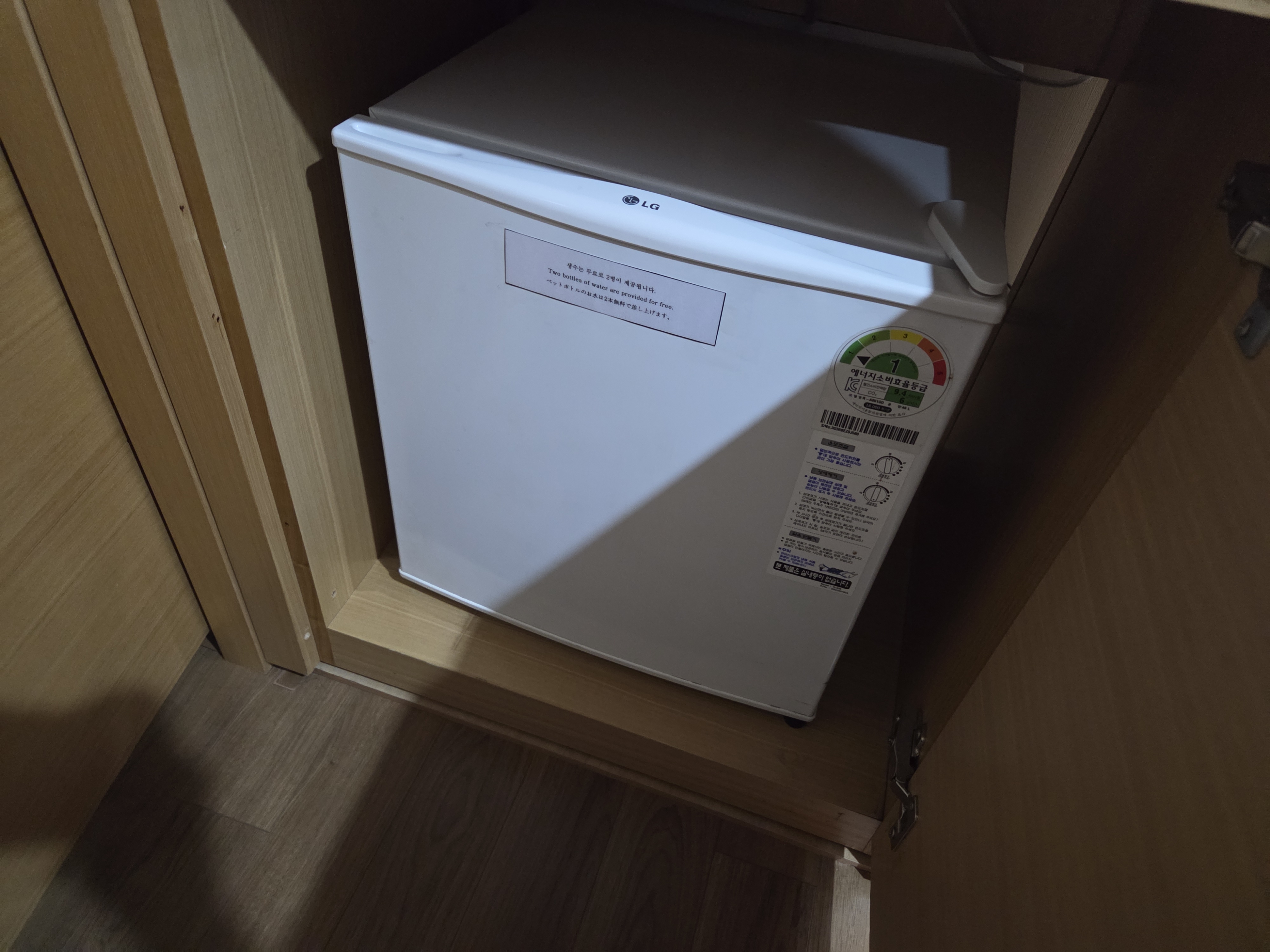 옷장 옆에는 오래되보이기는 하지만 티포트와 티백, 커피가 있구요, 미니 냉장고가 있습니다. 냉장고에는 생수 2병이 들어있었습니다.