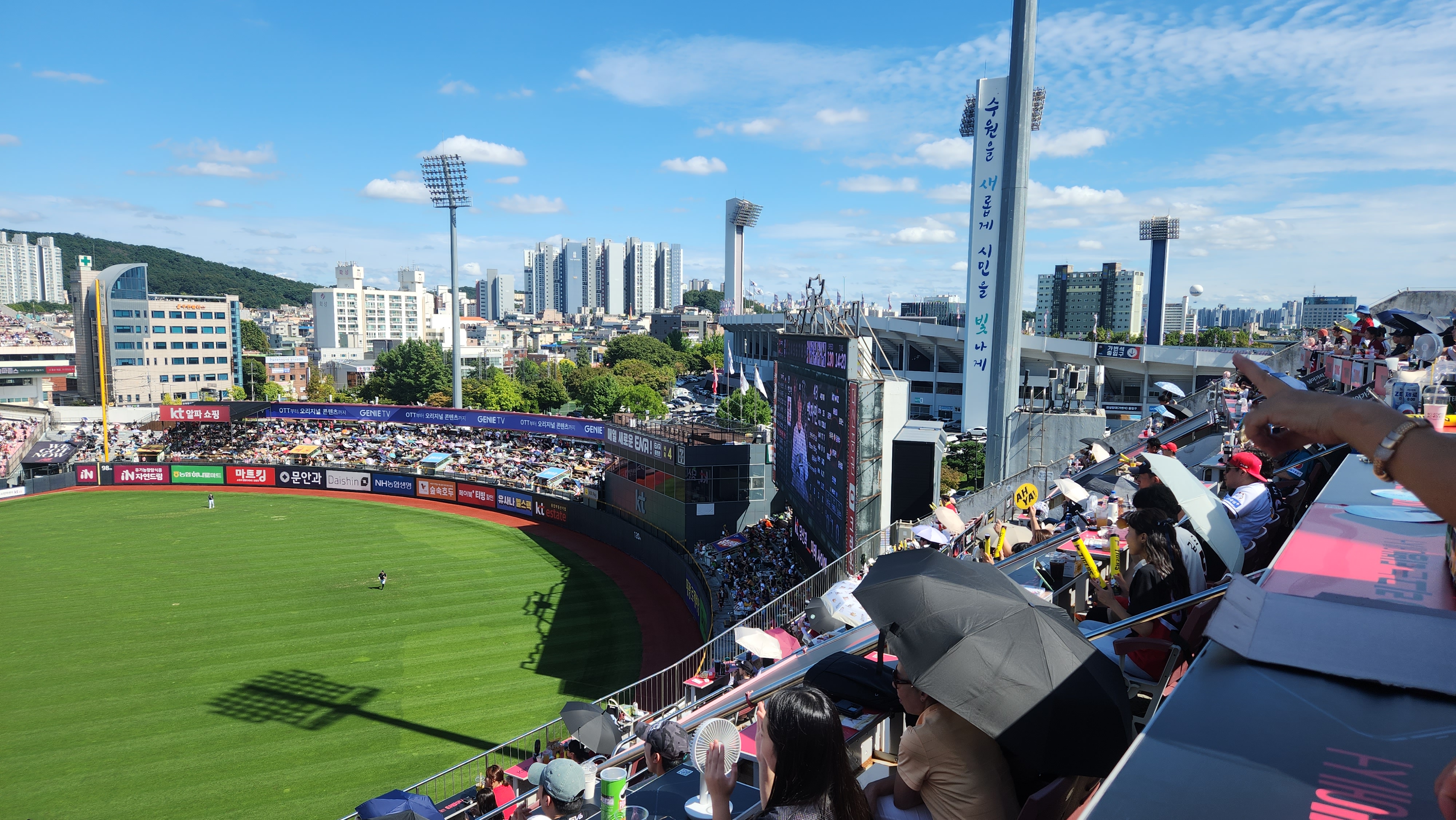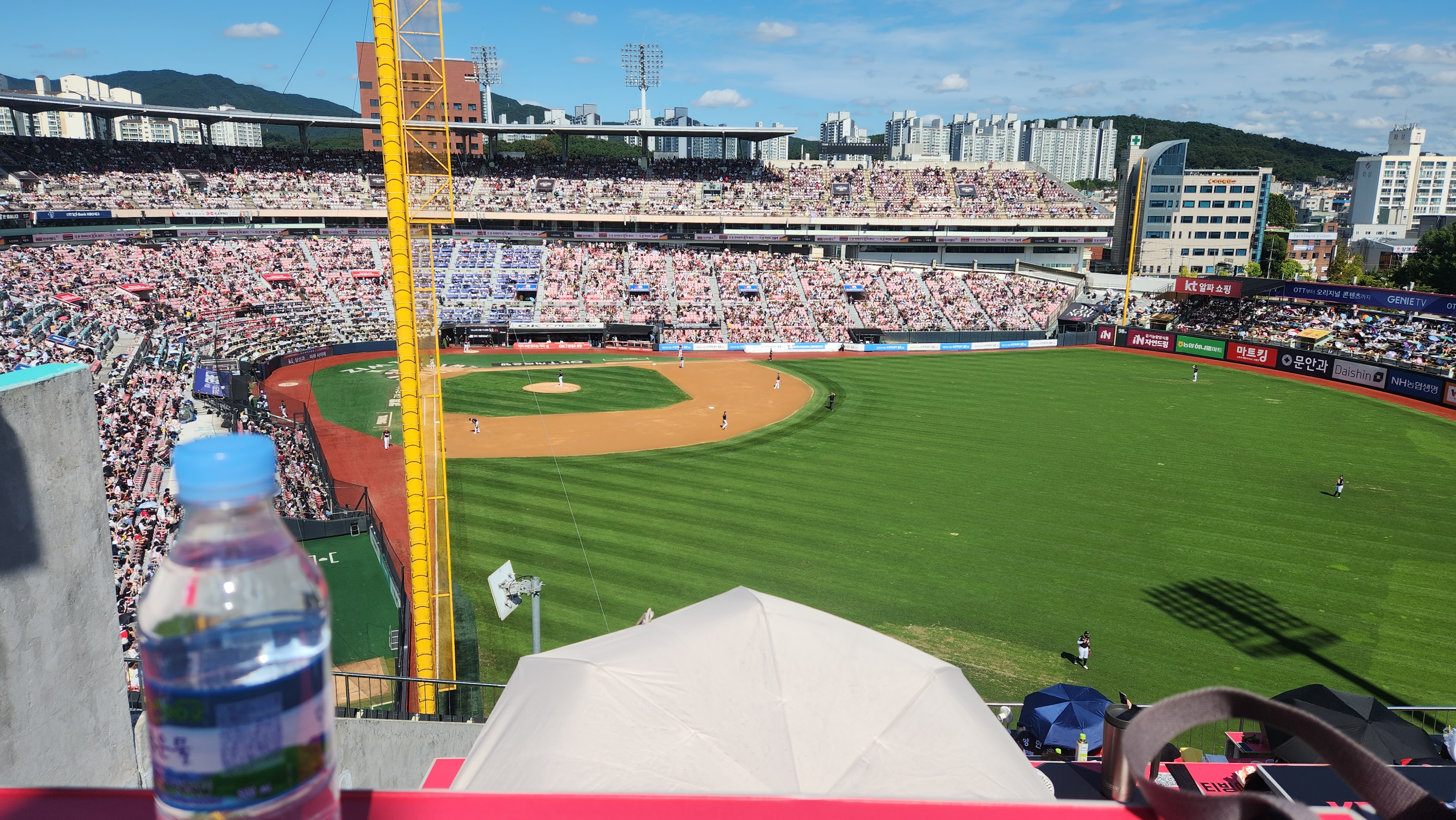 그리고 이 자리는 햇빛을 가려줄 천장이 없기때문에 주말 낮경기의 경우 해를 가려줄 양산이나 모지, 선글라스 등이 필수입니다. 많은 분들이 양산(우산)을 쓰고 경기를 관람하고 있습니다.