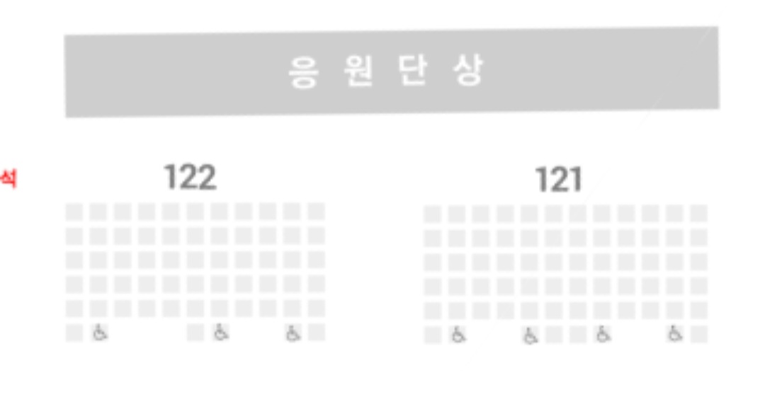 위즈파크 응원지정석은 빨간색 부분입니다. 응원단상은 121, 122구역 바로 앞에 있습니다.