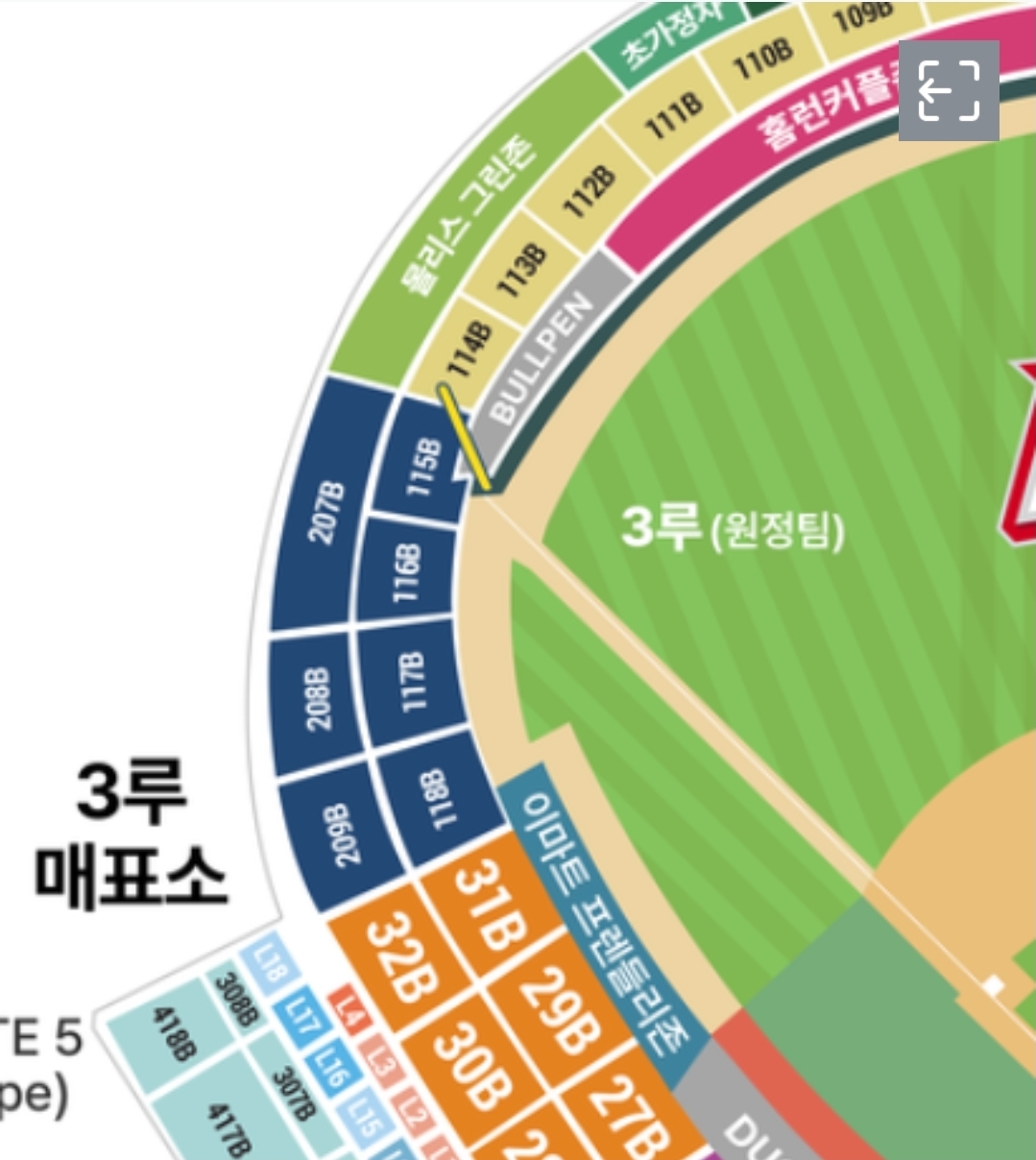 3루 내야필드석 118블럭 위치입니다. 주황색 자리가 응원석이고 응원석 앞라인(31B,29B,27B)에 응원단상이 있습니다.