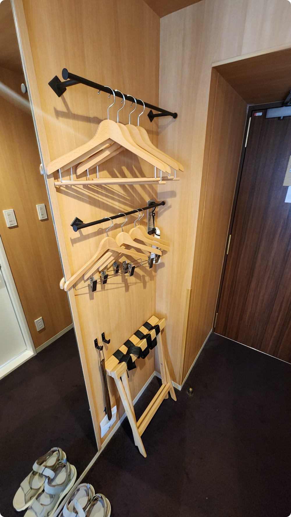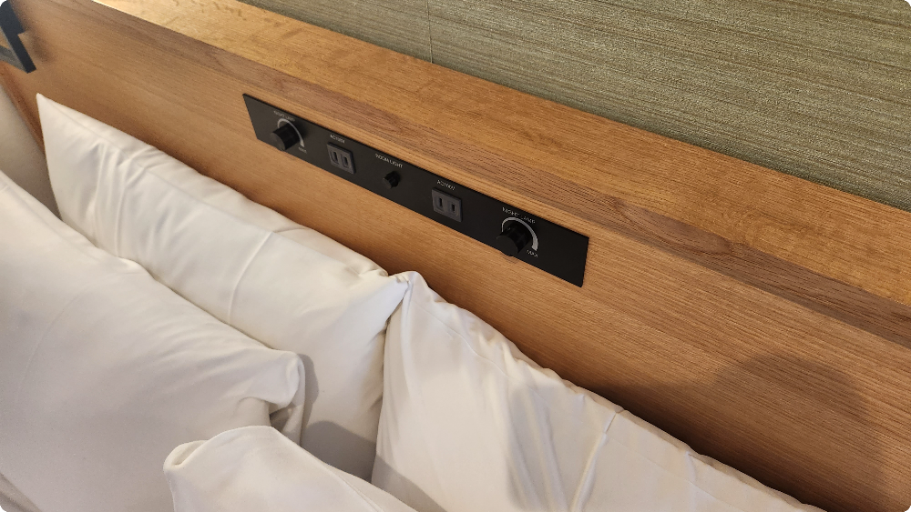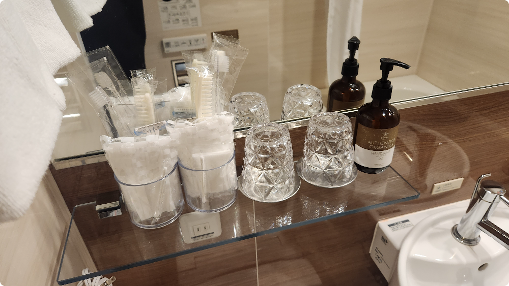 콘센트가 침대쪽에도 있어서 사용하기 편리했고, 옷걸이도 충분히 제공됩니다. 옷걸이 뒤쪽에 살 안보이지만 탈취제가 비치되어 있어 잘 사용했습니다. 욕실은 대욕장이 있기 때문에 사용하지는 않았지만 욕조도 있습니다.
