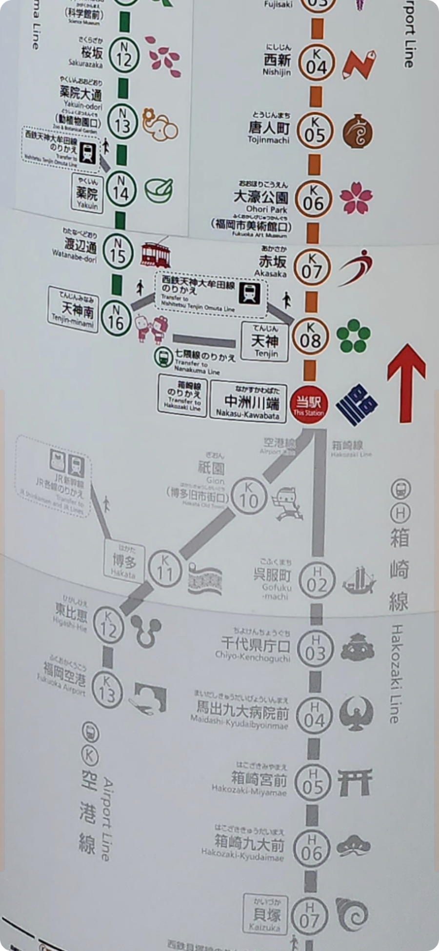 나카스가와바타역은 주요 관광지인 텐진, 하카타 그리고 후쿠오카 공항도 전부 다섯 정거장 이내로 이동 할 수 있습니다.