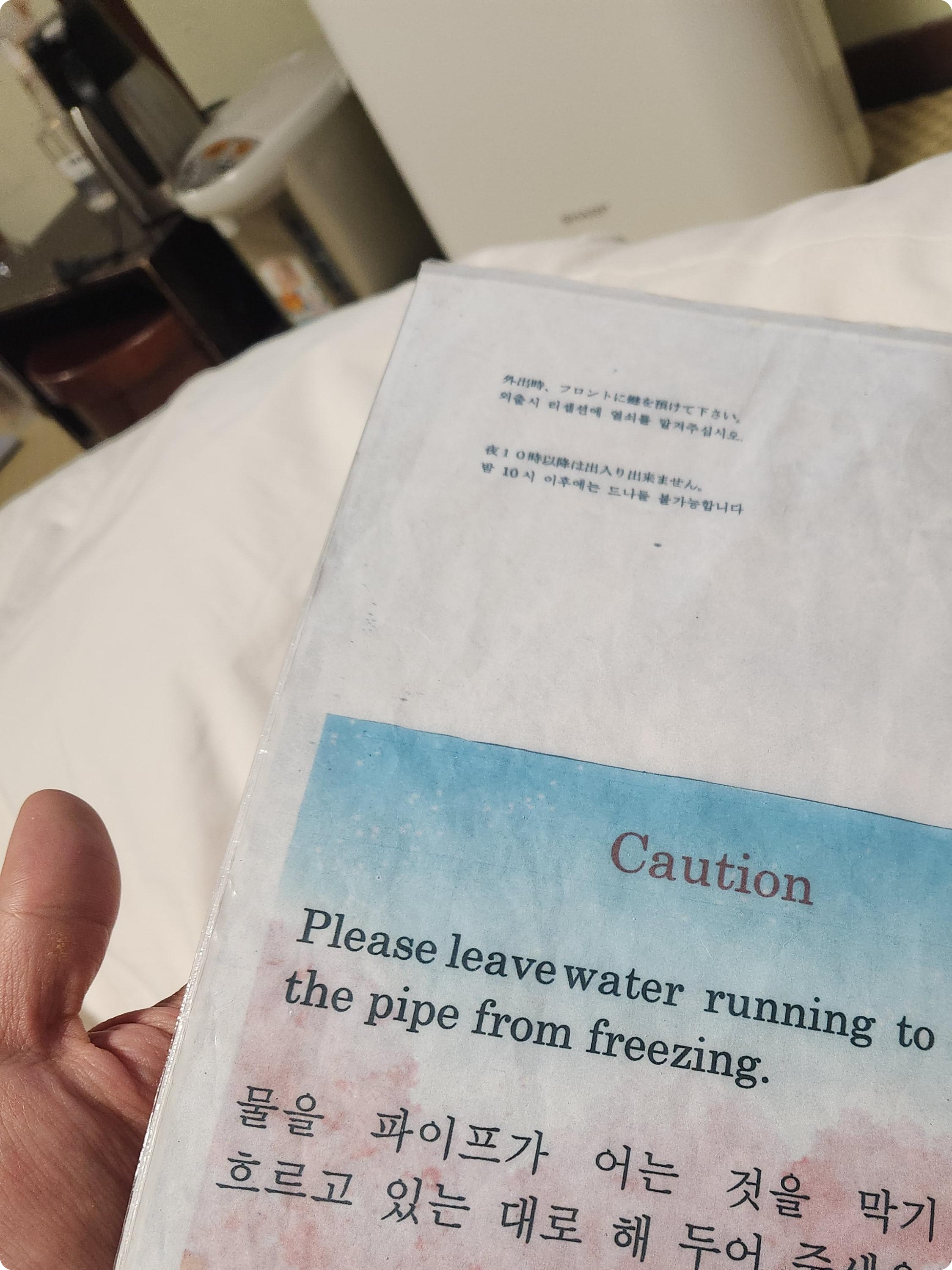 그런데 이 샤워기는 온천물과 같은 물을 끌어다 쓰는 구조이고, 겨울철에는 차가워진 바깥 기온 때문에 온천물 유지를 위해 샤워기 온도와 수압이 엄청나게 약해집니다.