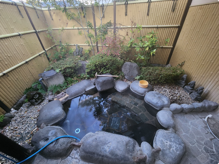 유후인 사쿠라테이 료칸의 노천탕은 천연온천수를 사용하기 때문에 조금 뜨거운 편인데요, 온천 옆에 찬물을 틀 수 있는 수도(호스)가 있어 그걸로 온도를 조절 하면서 온천을 즐기실 수 있습니다. (사진 중앙에 보이는 나무 막대기로 저으면서 온도 조절)