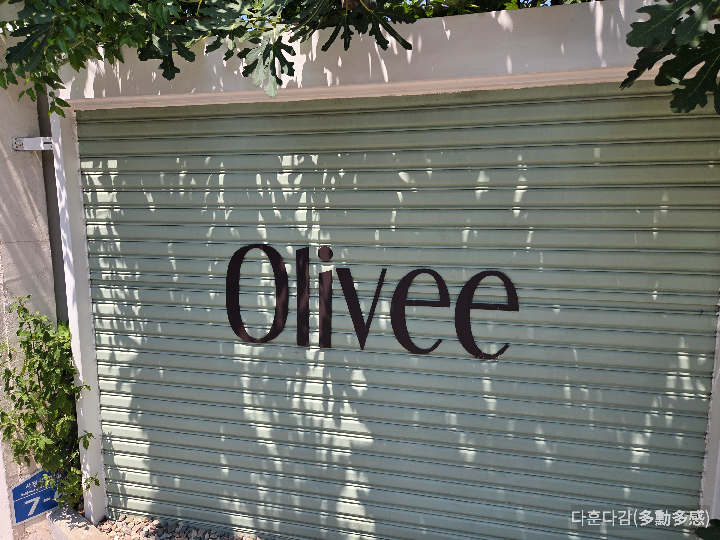 정원에는 거울앞 의자, 별관 우측 창문아래 의자에 포토존도 마련되어 있구요, 입구 옆 셔터도 올리브색과 로고로 꾸며져 있어 사진을 찍기 좋았습니다.