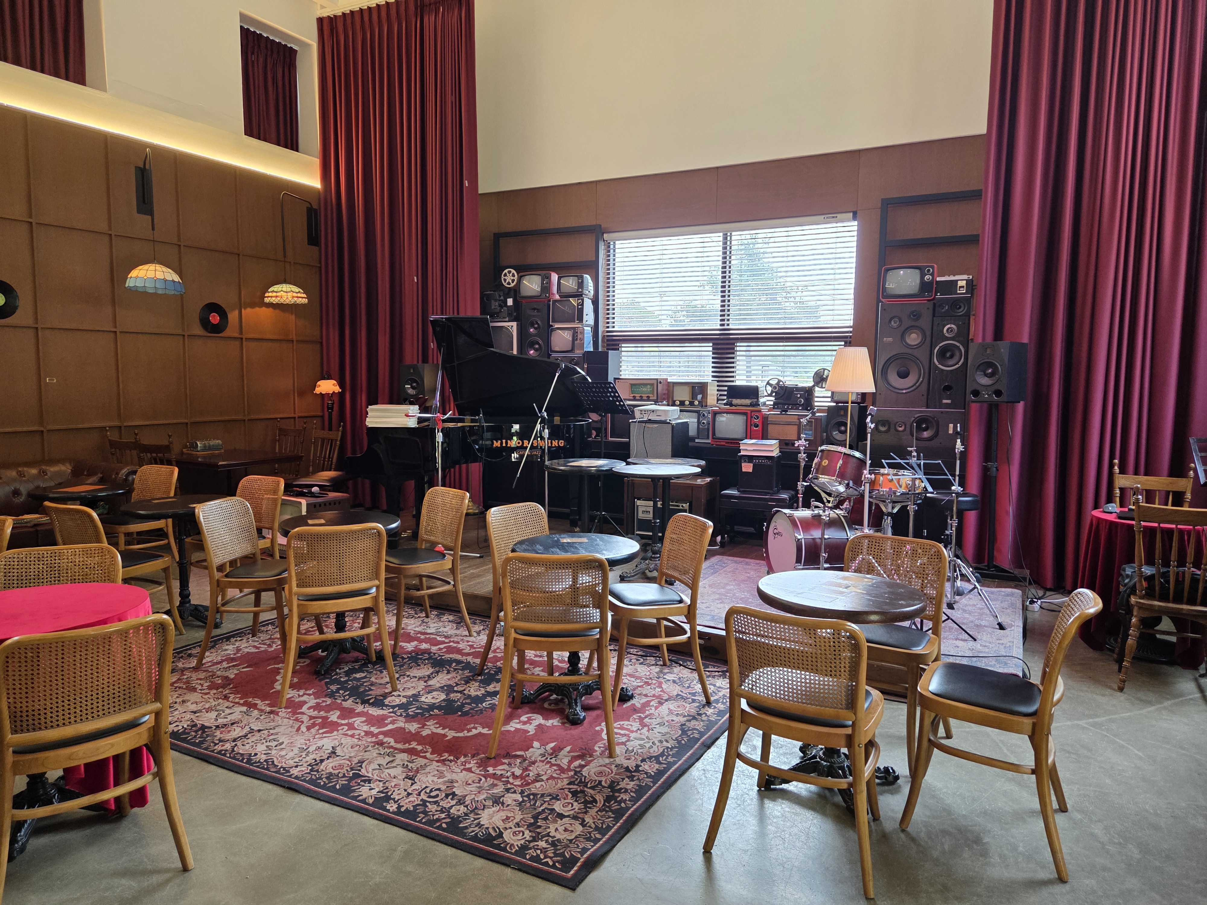 공연무대 앞쪽으로 원형 테이블이 자리잡고 있고,