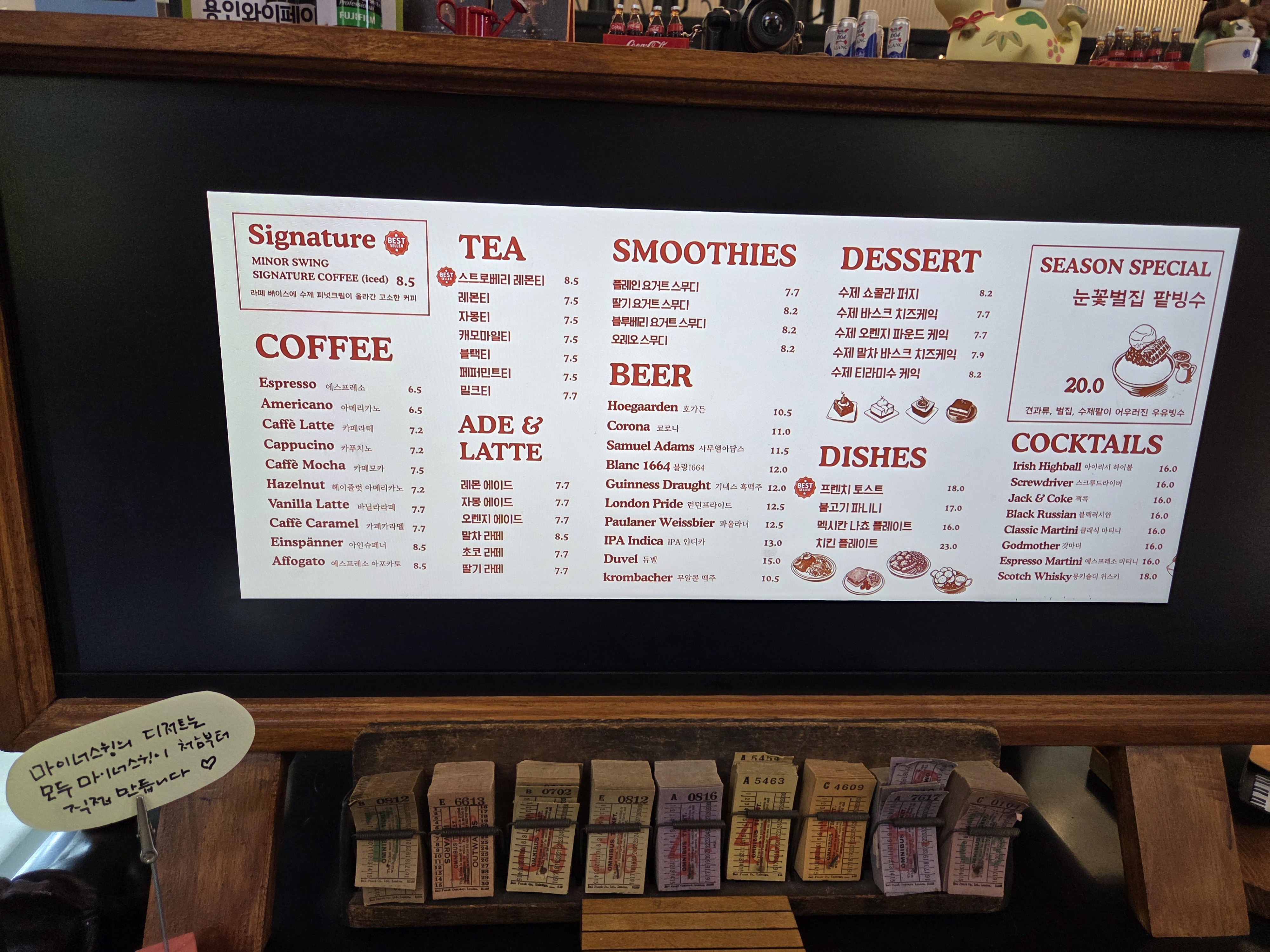 카페 메뉴입니다. 디저트류도 있는데 마이너스윙의 모든 디저트는 전부 직접 만드신다고 합니다. 커피뿐만 아니라 브런치와 맥주, 칵테일도 판매하고 있습니다.