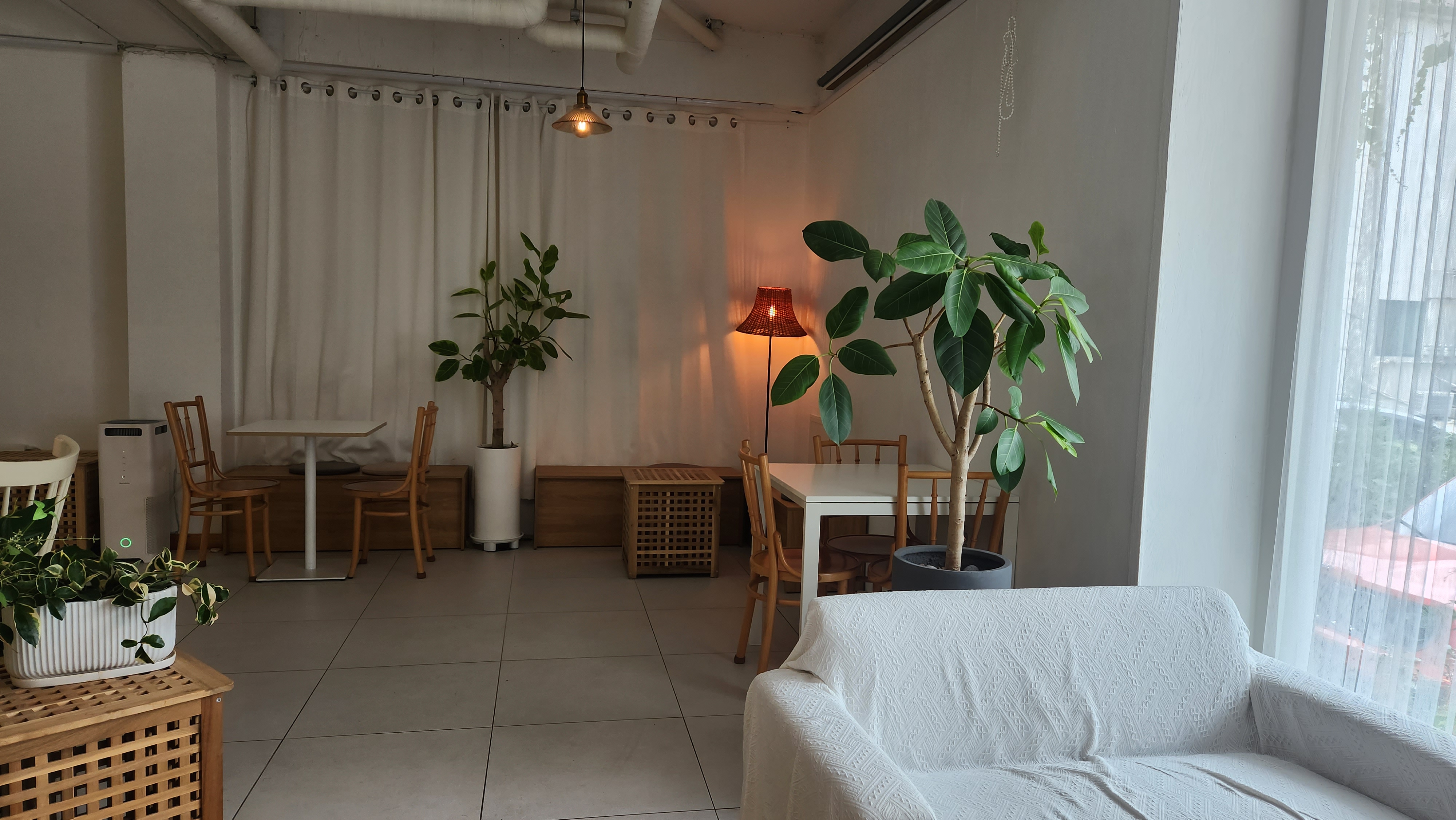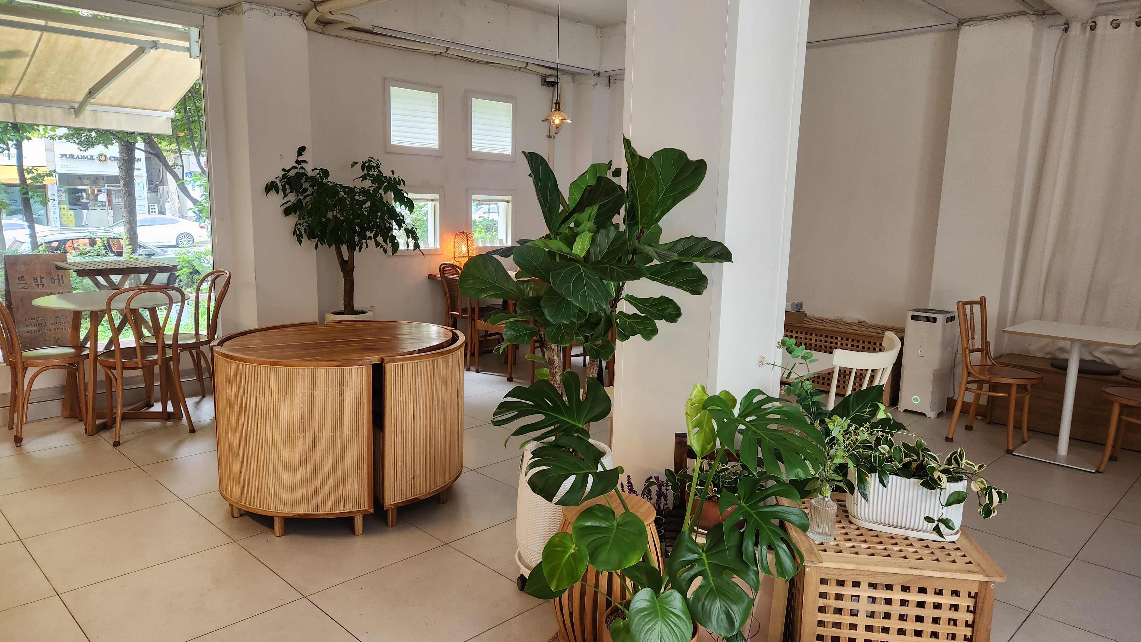 카페에 들어서면, 따뜻하고 편안한 분위기가 느껴집니다. 우드톤 좌석과 잘 가꿔진 식물들이 주는 특유의 느낌이 개인적으로 마음에 들었습니다.