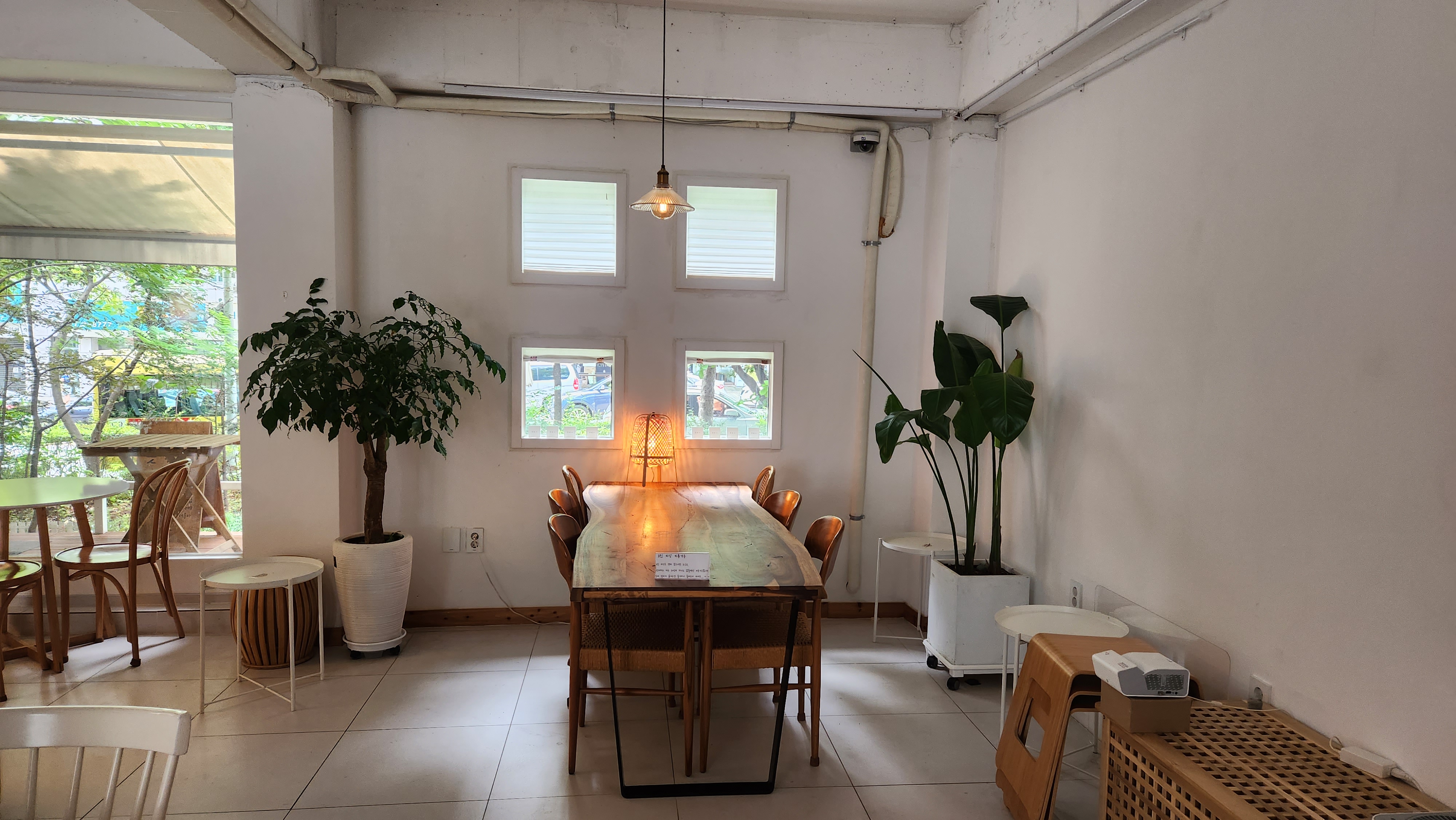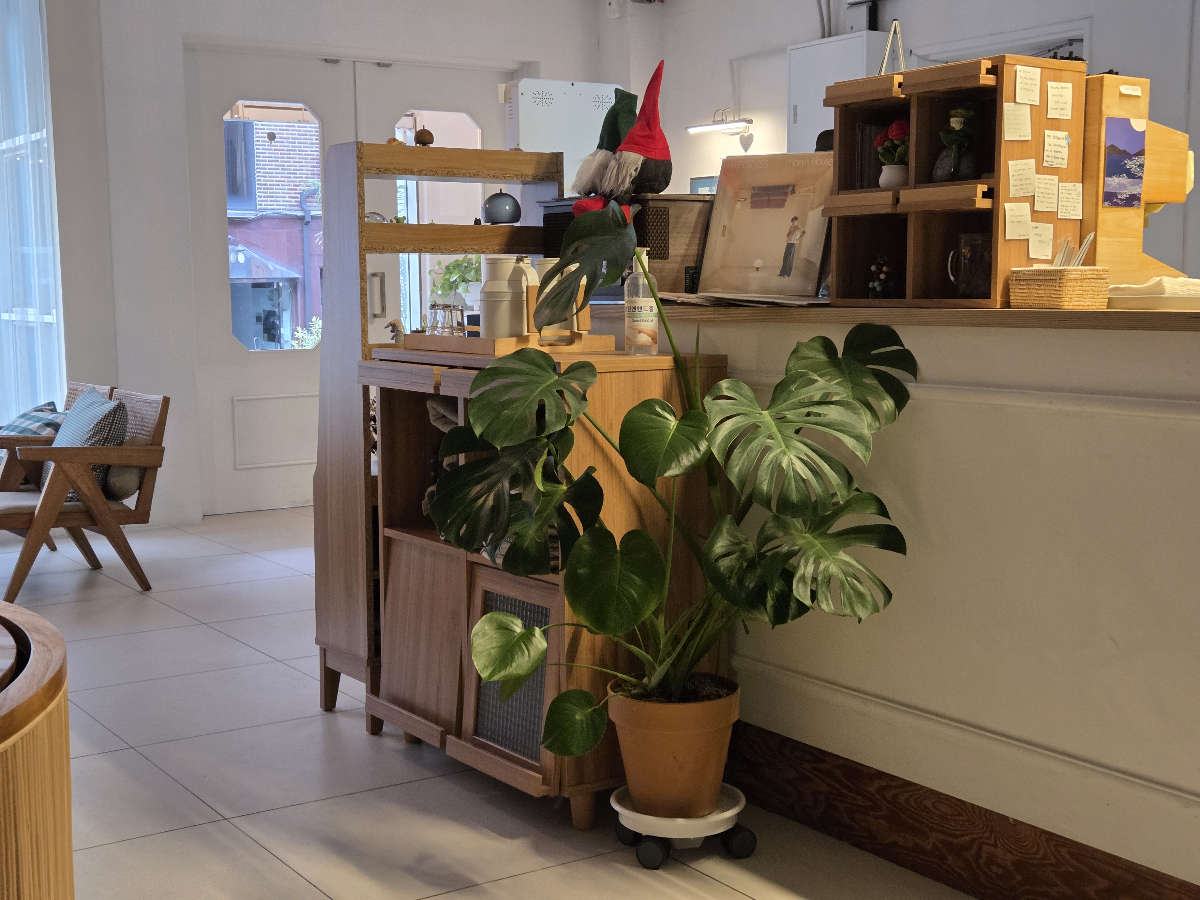 카페 내부 가구들과 소품들, 그리고 식물까지, 잘 어우러진 인테리어가 마음을 더 편안하게 해주는 것 같습니다.