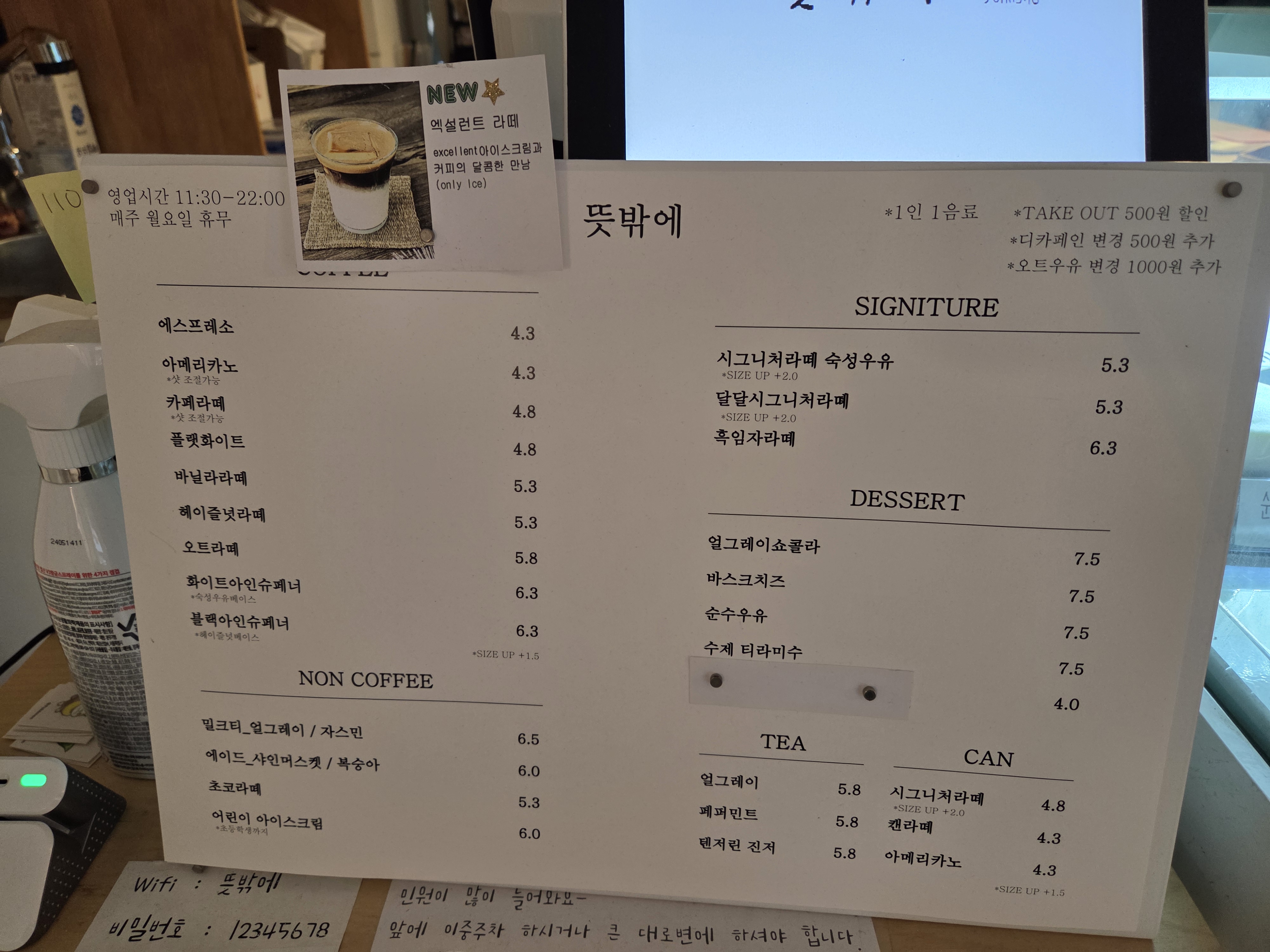 카페메뉴입니다. 시그니처라떼와 아메리카노도 맛있지만 개인적으로는 흑임자라떼와 밀크티도 정말 맛있었습니다.